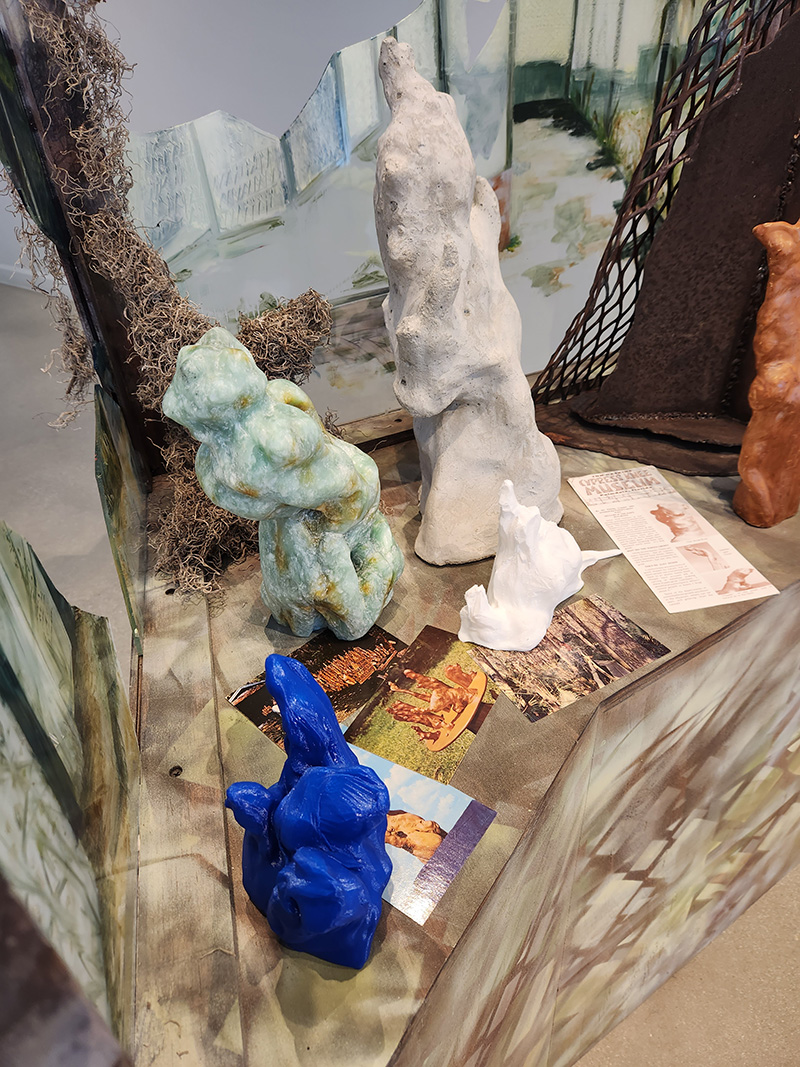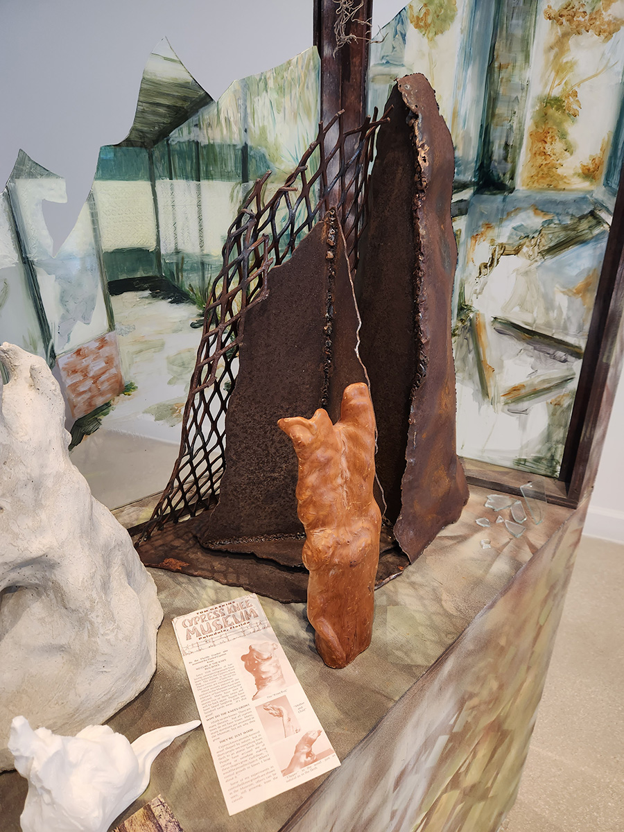 Tom Gaskins’ Cypress Knee Museum was located of US-27 in Palmdale, FL. Tom Gaskins was an eccentric man, fascinated with the unusual protrusions that came from the root systems of cypress trees in the area, and he constructed a shrine to their unique formations. As Disney World profoundly changed the tourist landscape of Florida, many of these smaller and quirky roadside attractions met the same fate as the Cypress Knees Museum, which has been abandoned for over 20 years. In my work, I’ve recreated a small section of the museum, combining various elements of the visceral experience of exploring its ruins. The glass cases